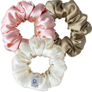 Jedwabne gumki do włosów Qrown – zestaw 3 szt. (Champagne, Biała, Jasnoróżowa)